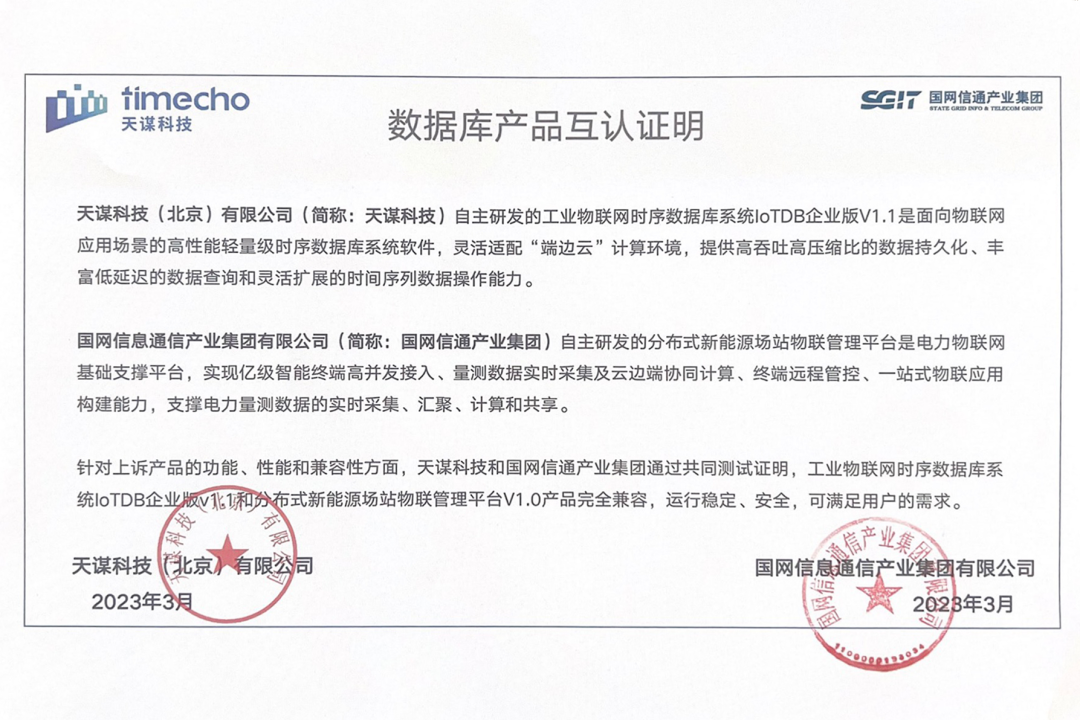 近日,天谋科技(北京)有限公司(以下简称天谋科技)自主研发的工业物联网时序数据库系统 IoTDB 企业版 V1.1 顺利通过国网信息通信产业集团有限公司(以下简称国网信通产业集团)的分布式新能源场站物联管理平台 V1.0 的相互兼容性测试认证,并获得产品兼容性互认证明证书。经过严格的联合测试验证,双方产品能够完全兼容,运行稳定、安全,满足用户的关键性应用需求。