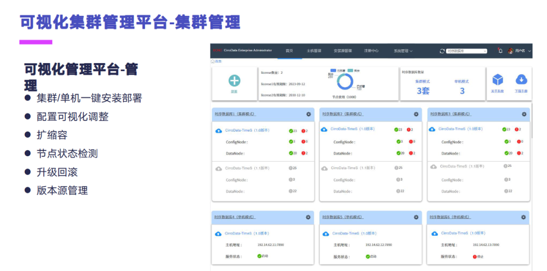下面我来介绍一下我们基于以上几点思考的话做的一些功能增强。第一块的话是可视化的集群管理工具,主要是用来做一些集群的一些管理,比如包括集群或者单机的一键安装部署,还有配置的可视化的调整,扩缩容,节点状态检测,升级回滚,版本源管理等等。