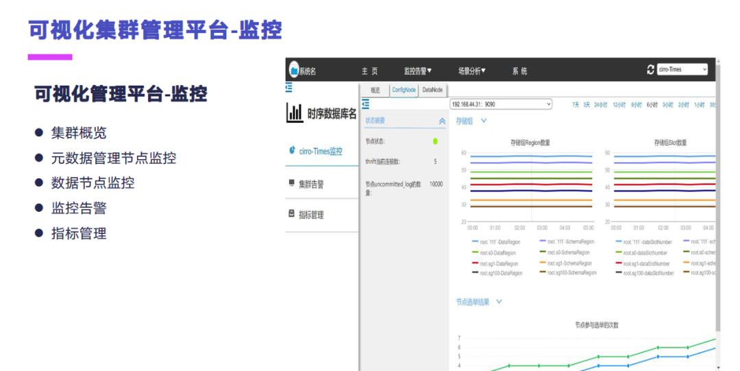这个是我们的一个监控平台,其实它还是在可视化的管理平台上面做的。这个可以看到一些集群的概况,然后还有元数据节点的一些管理,数据节点的一些管理,包括监控报警,指标的一些管理。