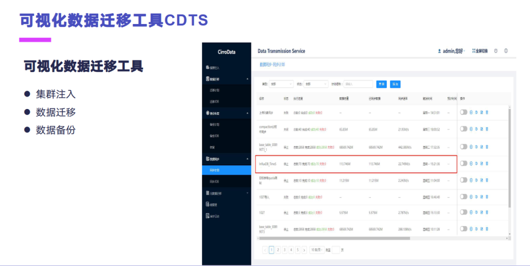 下面是我们的一个可视化的数据迁移工具 CDTS,这个的话是可以跟可视化集群管理平台联动,从管理平台导入集群的一些信息。数据迁移主要是一些旧的数据文件和系统数据导入到时序库里面,还有做一些数据备份的一些功能。这个就是数据迁移的话,它支持这种并发的迁移,能达到比较好的一个速度。