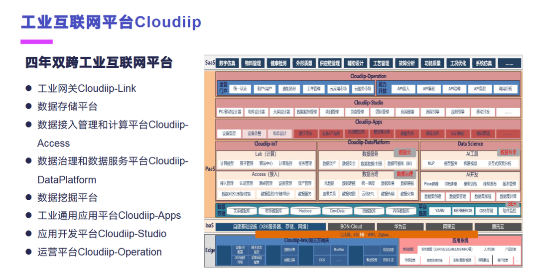 这个是我们的一个工业互联网平台,它是一整套解决方案,这是连续四年上榜国家双跨工业互联网平台前五名的工业的产品。覆盖数据采集、数据传输、数据存储、数据计算、数据建模、数据可视化、运营管理等多个方面的功能,提供一整套工业数据采集、存储、价值挖掘的解决方案。