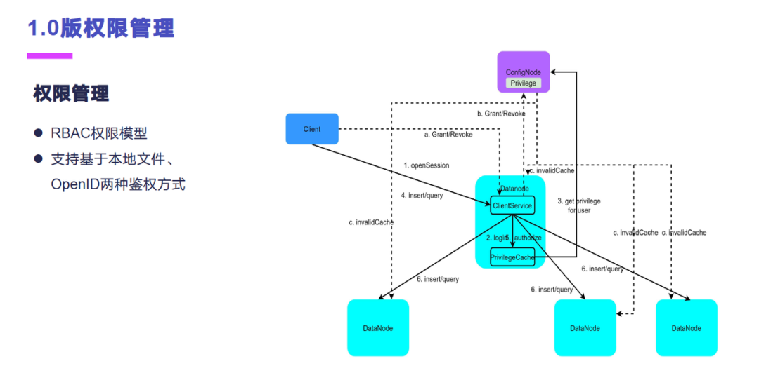 权限管理这一块我们参与了1.0版本的权限管理。权限管理的话实际上是基于角色的权限模型,目前的话是支持本地文件和 OpenID 两种认证模式。权限数据默认情况是存放在控制节点上面的,客户端访问数据节点之后,数据节点会有缓存,控制节点的权限数据在本地进行权限控制,尽量降低对控制节点的一些负载。