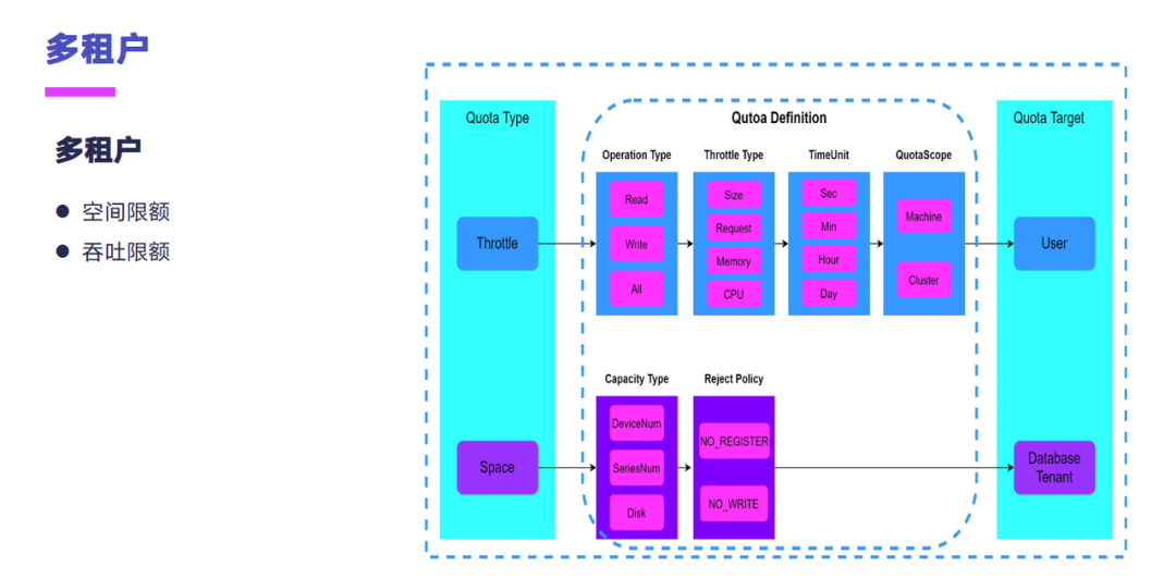 这是我们做了一个多租户的一个功能。这个功能主要是我们遇到的一个面向于集团的场景,他们会有多个厂使用总部的一套环境,每个厂只给分配一定的资源,防止对其他厂的一些影响。我们主要实现了两大类资源的一些限制功能,包括空间的一些配合,还有吞吐的一些配合。空间配合主要是面向数据库租户的,支持对磁盘空间、时间序列个数、设备个数的限制。吞吐配合主要是面向于用户的,支持对读写多维度的限制,例如请求大小、请求次数、请求使用的 CPU 和内存资源等,面向的对象是用户,作用范围可以是单机的,也可以是集群的。这个目前的话还没有提交到社区,后面的话我们也会提交到社区。