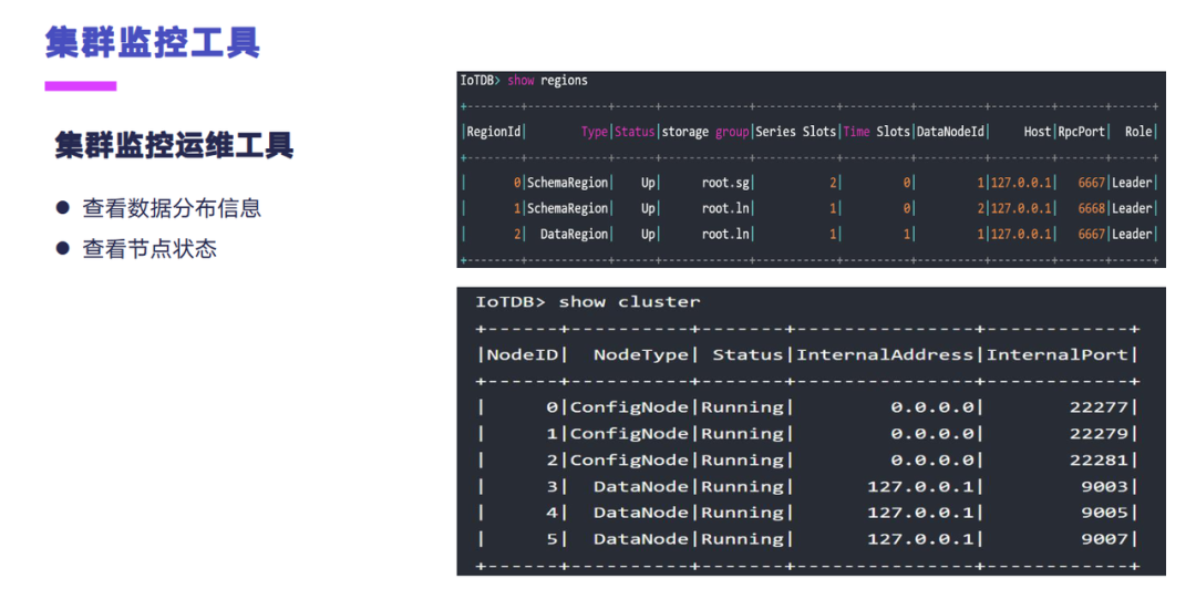 这个是我们做的一个集群监控运维工具。这个是 1.0 版本上面提供的,主要是用来查看数据的分布信息,还有节点的状态,方便于运维人员还有开发人员排查问题的时候能查看到数据的,还有经营、节点的一些状态。