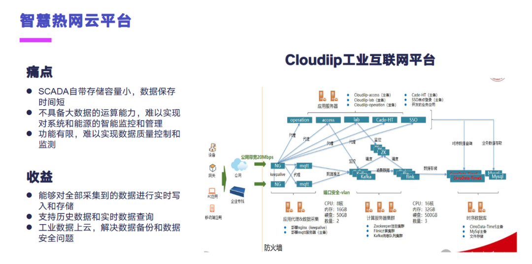 这个是一个智慧热网云平台,它原来的话是直接采用 SCADA 存储数据,并没有进行历史数据积累,然后不具备大数据的运算能力,难以实现对系统和能源的智能监控和管理。原来的系统的话功能比较有限,难以实现数据质量控制和监测。后面也是采用了我们 Cloudiip 工业互联网平台,能够对全部采集到的数据进行实时写入和存储,支持历史数据和实时数据的查询分析,然后数据上云之后,解决了数据备份和数据安全的一些问题。