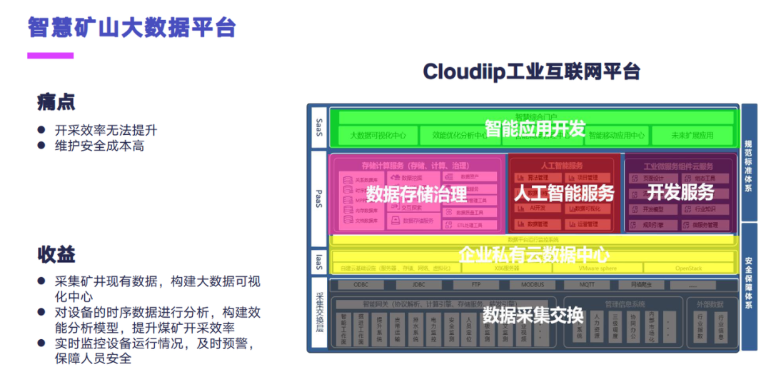 最后一个案例是智慧矿山大数据平台。这个原来主要是因为他们的煤矿里面开采的效率无法提升,然后维护安全的成本比较高。后面采用我们 Cloudiip 工业互联网平台,带来了以下几个收益。第一是采集了矿井现有的数据,构建大数据可视化的中心,能实时对数据进行查看。第二块的话是对设备的时序数据进行一些分析,构建效能分析模型,提升煤矿的开采效率,还能实时地监控设备运行状况,及时地预警,保证人员的安全。