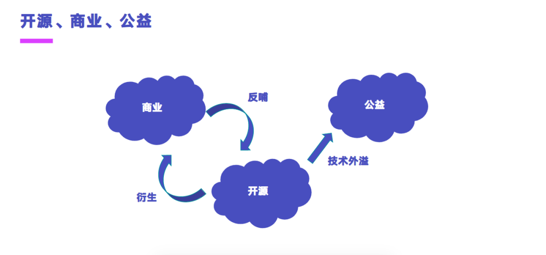 最后分享一下我们对开源、商业和公益的一些理解。我们认为做开源其实就是在做公益,因为做开源的话它具有两个好处,第一个就是它提供一个学习交流的平台,能让技术比较先进的一些地方,能把这种技术传播到技术稍微薄弱的一些地方。然后开源的话还能提供比较低成本的一些开源产品,让这种非信息化的一些行业,它能享受到信息化带来的一些好处,所以做开源就是在做公益。但是做开源其实对于产品来说也是有一些技术价值的,比如说它具有开放式协作的能力,用户和开发者能共同的推动产品的发展,产品迭代的速度比较快,成熟度更高。