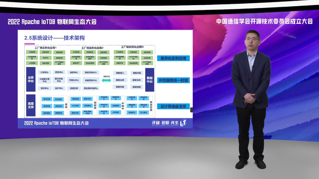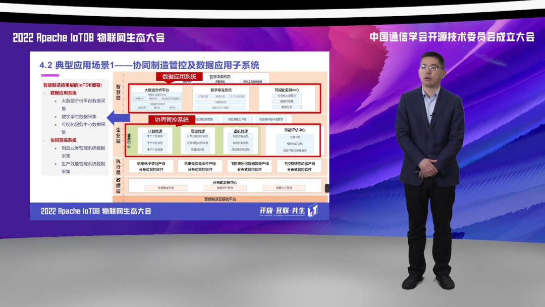对于应用侧,通过与协同管控系统和数据应用子系统一些包括像大数据分析平台、数据孪生系统、可视化服务中心、包括业务中心的计划管理、质量管理等 APP 进行一个交联。