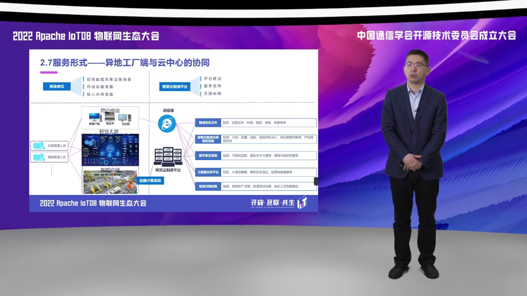整体的共同架构是以覆盖云边端这样的一个形式,边缘侧则是以智能化工厂,通过一个智能化改造以及现场统一部署的数据采集与管控系统,来实现对于制造现场数据的统一的采集和统一的一个归集。边缘侧是一套完整的 IoT 的边缘解决方案,实现云边协同,包括对于现场数据的统一的一个清洗、预处理,包括一些对于设备现场的数据的管控等等这些内容。云上则部署了包括数据中心、包括执行层的协同管控系统、包括企业层的计划中心、适航中心、业务中心等业务服务,以及智慧层的一些大数据、人工智能等服务内容,来实现对于制造过程的一个统筹。