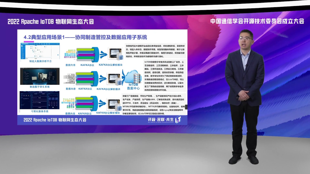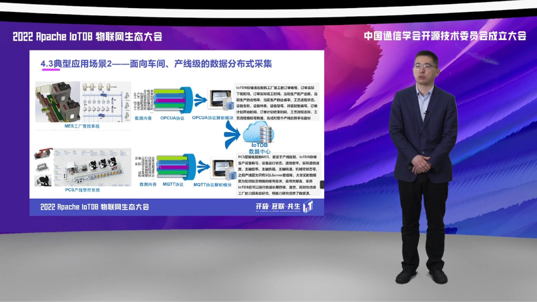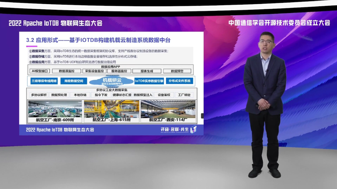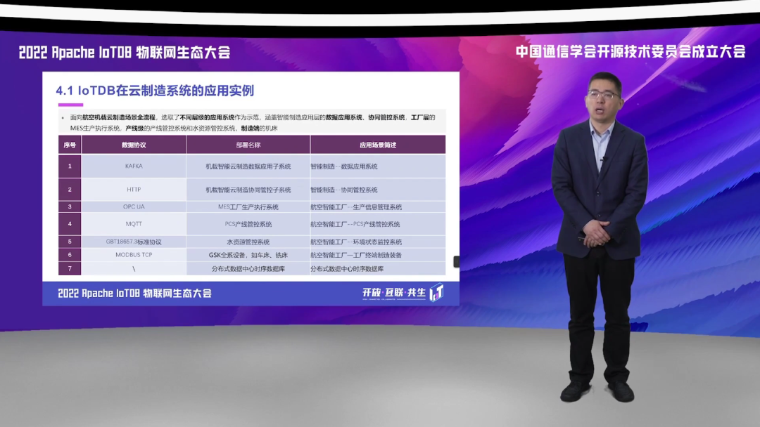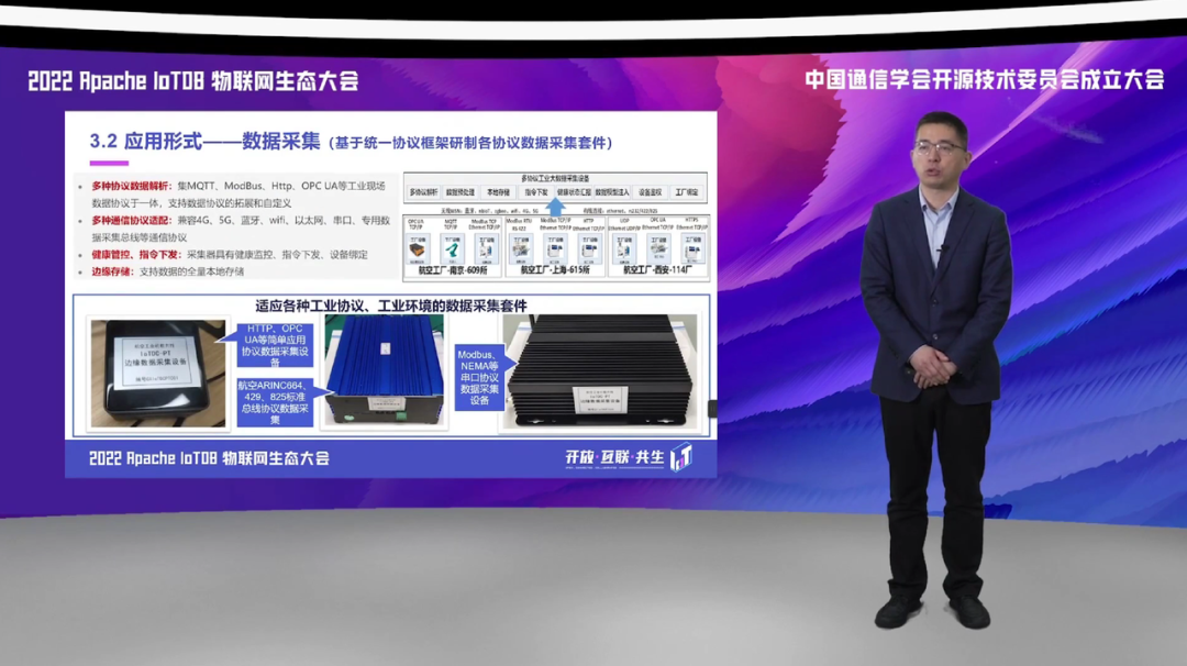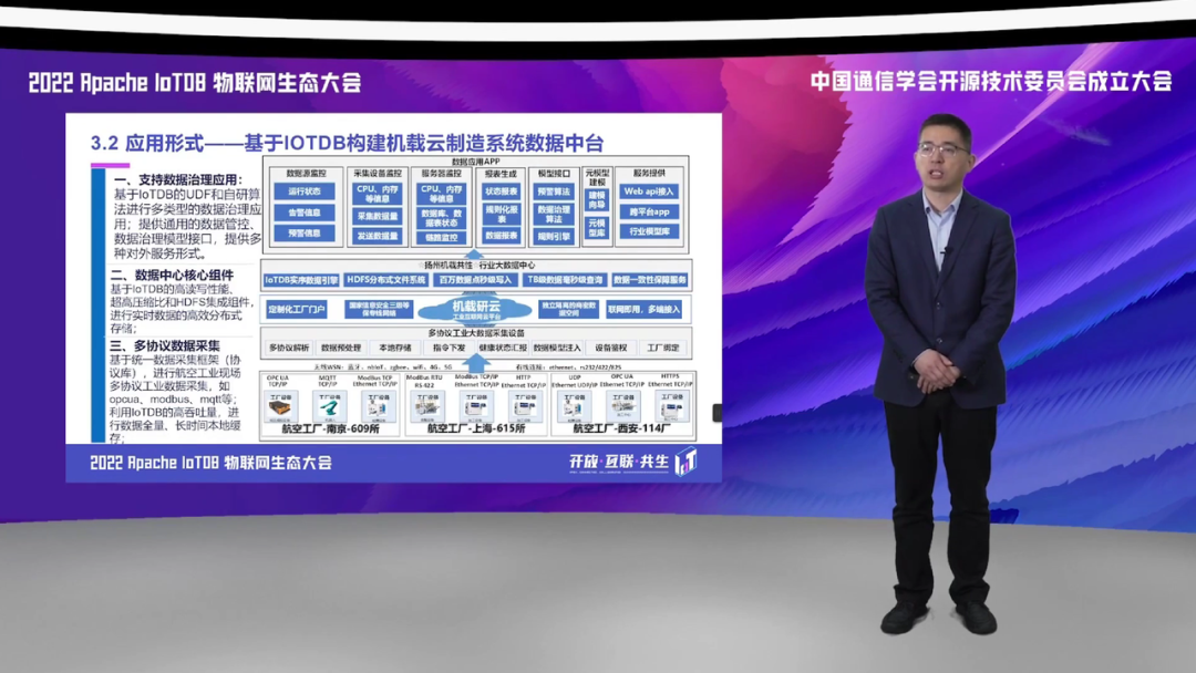 第三方面,我们应用到边缘侧和现场侧,实现了对于多种协议的数据采集,基于 IoTDB 的统一采集框架,实现了对于我们航空生产制造领域涉及的包括 OPCUA、Moudbus 等数据协议的一个高速缓存和采集。