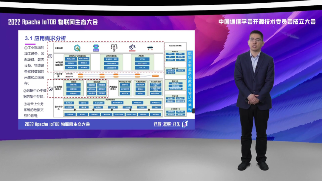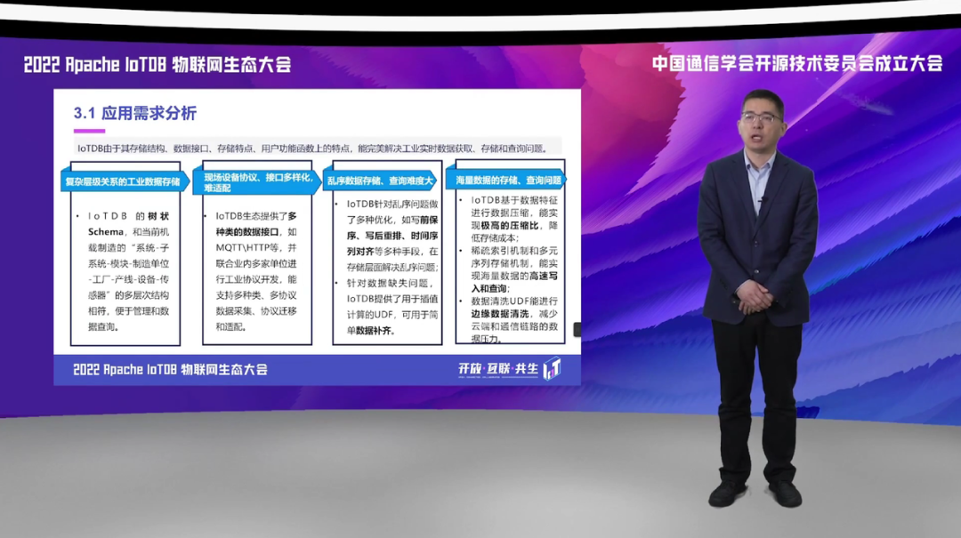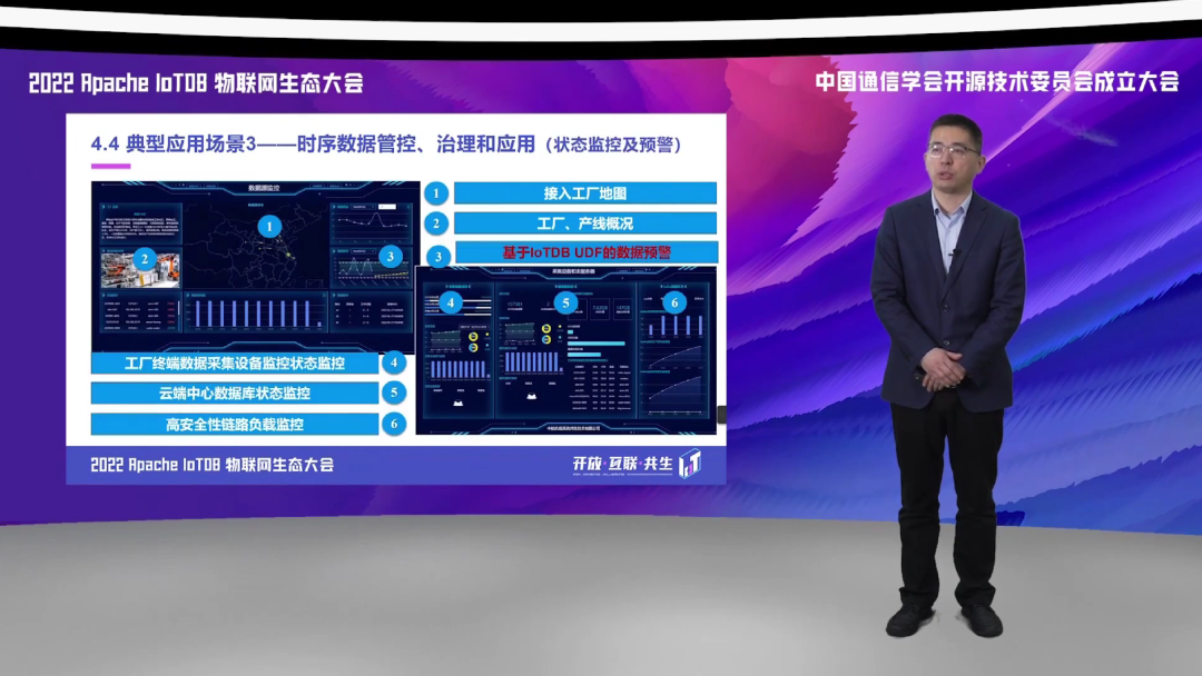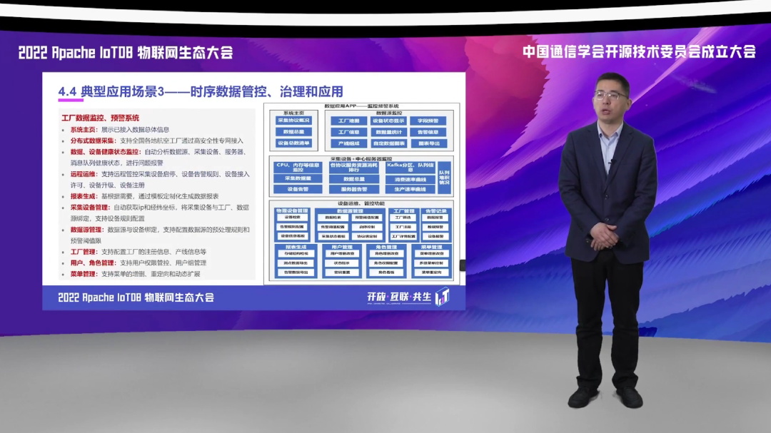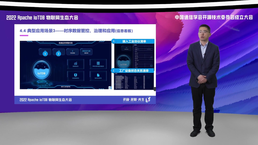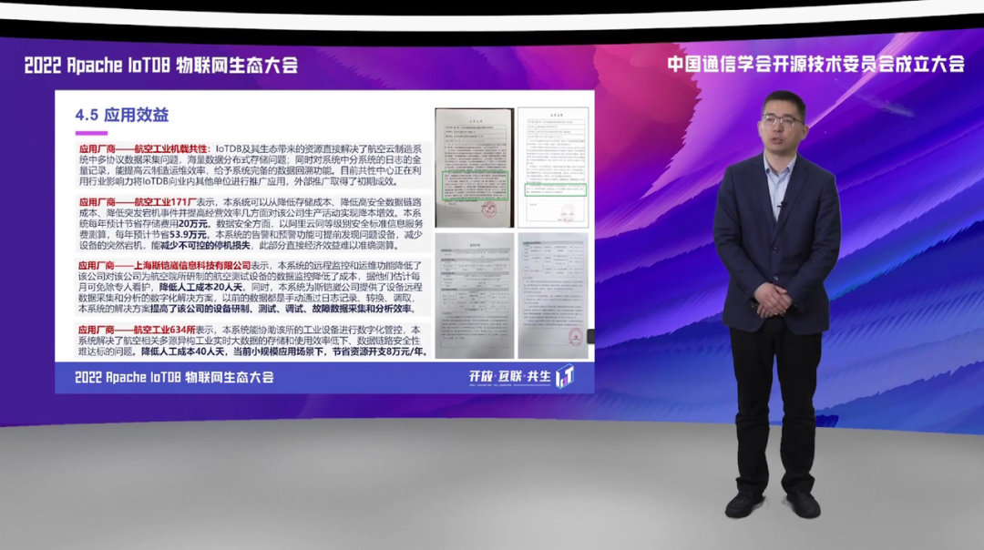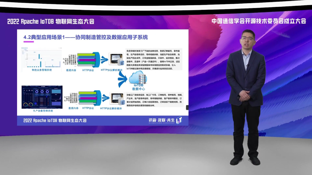 第三方面,我们应用到边缘侧和现场侧,实现了对于多种协议的数据采集,基于 IoTDB 的统一采集框架,实现了对于我们航空生产制造领域涉及的包括 OPCUA、Moudbus 等数据协议的一个高速缓存和采集。