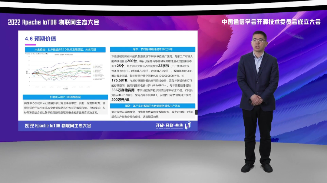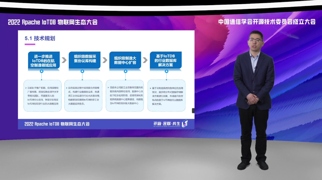 第五方面是对于未来的规划。基于 IoTDB 我们希望在未来能进一步推进 IoTDB 在航空制造领域的应用,通过接入更多的工厂,包括通过 IoTDB 在基于云制造中心里面构建更多的应用,来创造更大的价值。另外一方面,我们也是基于这样的平台和系统,将 IoTDB 构建这样组织级的数据采集协议库,并且将其部署在云制造中心里面,来向不同的工厂来提供服务。第三方面,也是来构建这样一个组织级的制造大数据中心,通过这样的中心的不断扩容来实现对于实时数据较好的一个存储,最终形成一些基于 IoTDB 的行业解决方案,向不同的单位来进行推送,形成一些商业的价值。