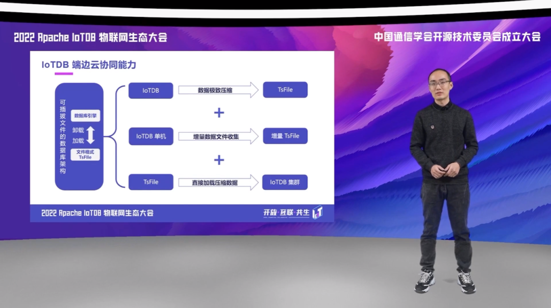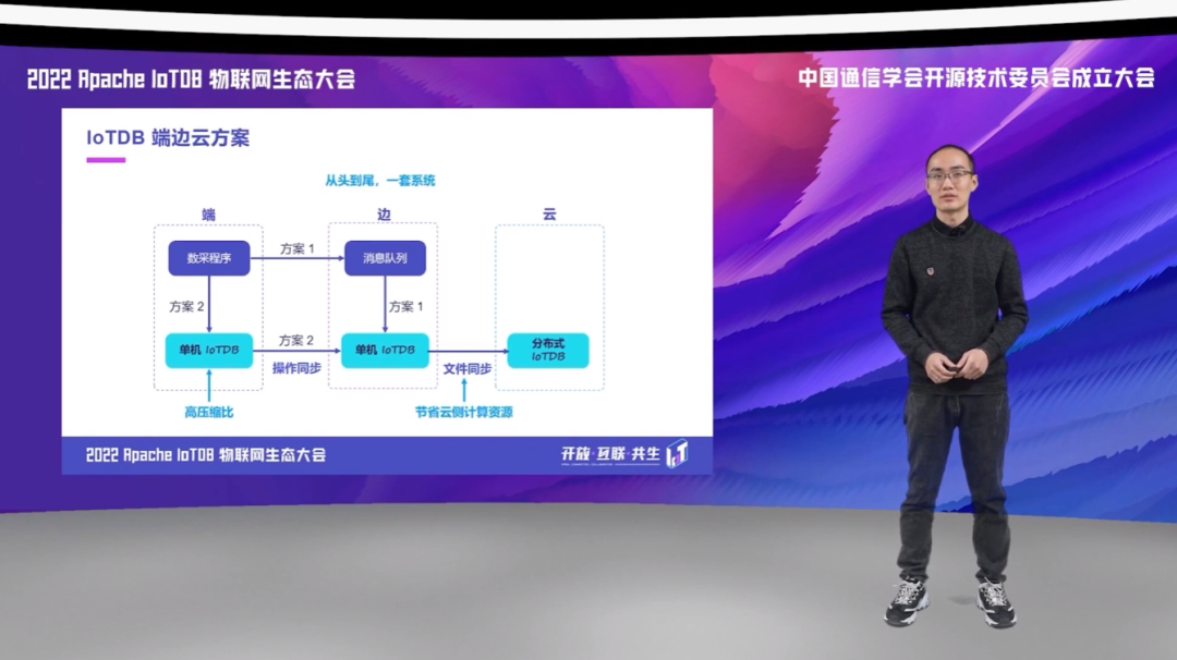 因此这种方案有三个优势,第一个就是在端侧的 IoTDB,因为它采用了一个高压缩比的文件格式,所以能够节省用户更多的磁盘空间。第二个就是从边侧到云侧的传输,我们一方面能够节省网络传输的资源消耗,同时也能够节省云端的计算资源的消耗。第三个就是从头到尾可以看到,都是 IoTDB 这一整套系统,它底层的数据文件格式也贯穿了端边云,没有采用更多的数据格式,为用户带来了更大的统一性,带来了更多的运维的便捷性。