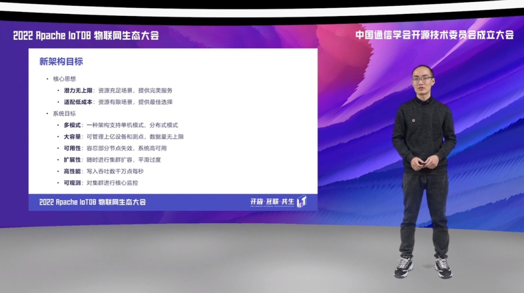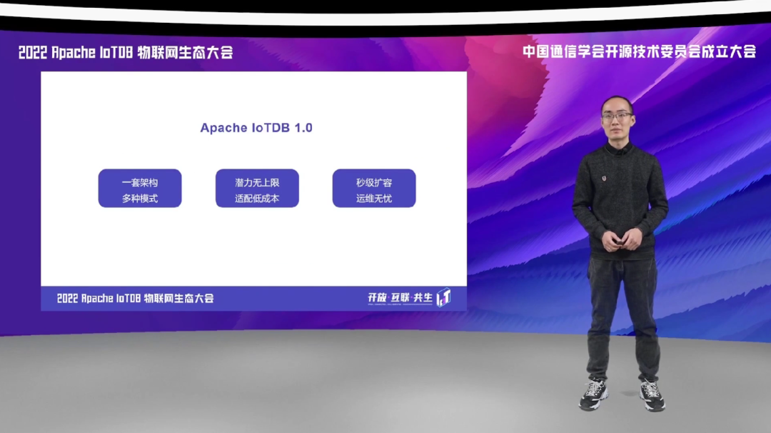 好,那么 Apache IoTDB 1.0 这个架构是支持了一套架构、多种部署模式,并且它的潜力是无上限的,能够适配更低的成本。同时它的特点有秒级扩容以及运维无忧。