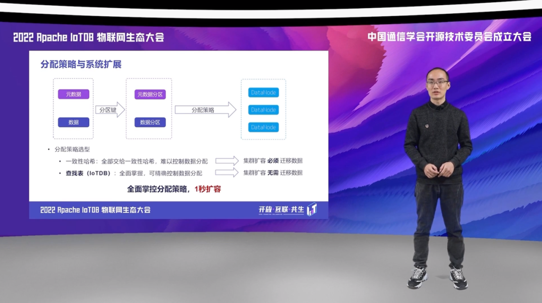 这两种分配策略其实在集群扩容的时候,是有比较大的不同的。一致性哈希它在扩容的时候,我们必须去迁移数据,来保证一致性哈希环的正确性。查找表这种方式,我们就可以按需的去进行数据的迁移,我们可以选择集群扩容的时候不去迁移数据,也可以选择去迁移数据来达到一个磁盘的平衡。通过前面的去掌控分配策略,IoTDB 能够达到 1 秒扩容的这样一个效果。