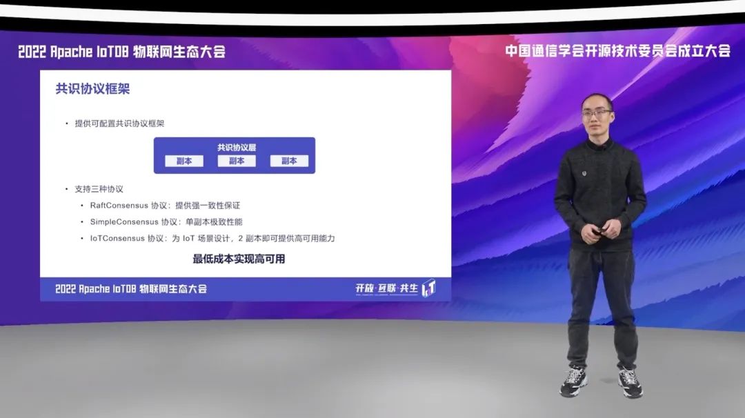 当前我们一共支持了三种协议,第一种就是 Raft 协议,这种协议能够提供强一致的保证。第二种就是 Simple 协议,这种协议只能够在单副本情况下运行,它能够提供一个极致的性能,因为它是最简的一个共识协议。同时我们也支持了一个 IoT 物联网的共识协议。这种协议是为物联网场景设计的,它的最大特点是通过两个副本,就能够提供一个高可用的能力。通过 IoT 协议我们也最低成本实现了这个高可用的功能。