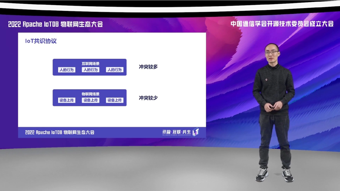 为什么我们能够去创新一个 IoT 协议?这里面我们要去看场景的负载,去进行一个分析。首先在互联网的场景里面,大多数的数据产生都是人的行为,人的行为很可能造成数据的冲突,所以它的冲突会比较多,它的这个共识协议也需要更多的机制去处理冲突解决。在物联网场景里面,数据都是从设备采集上来,并且上传到数据库里面去的,不同设备采集的数据通过不同的链路传上来,基本没有有这个冲突的概率。所以,由于物联网场景里面冲突比较少,所以这就给我们优化共识协议提供了更多的可能,也是我们去研发 IoT 协议的一个起因。