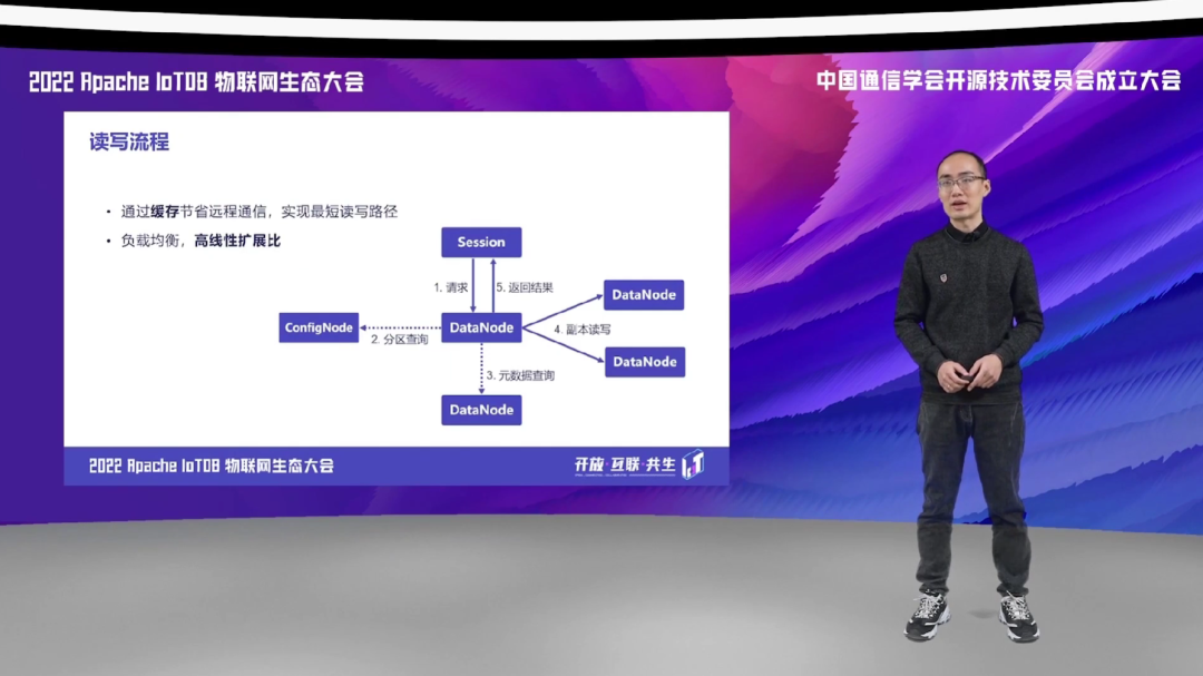 在读写流程里面,IoTDB 通过原生的接口 Session,把数据请求发送到一个数据节点上面之后,这个节点会去通过 ConfigNode 拉取数据分区,并且通过其他的数据节点来去拉取元数据,因为我们的元数据和数据可能不在同一个节点里面。经过元数据的拉取之后,我们进行一个数据的校验,这个时候就通过共识协议来去传到多个副本上,进行多副本的读写,最后再向用户返回结果。这个里面我们通过缓存,来去节省了里面这些虚线部分的网络传输,实现了一个最短的读写路径,通过负载均衡模块也实现了一个高线性扩展比的特点。