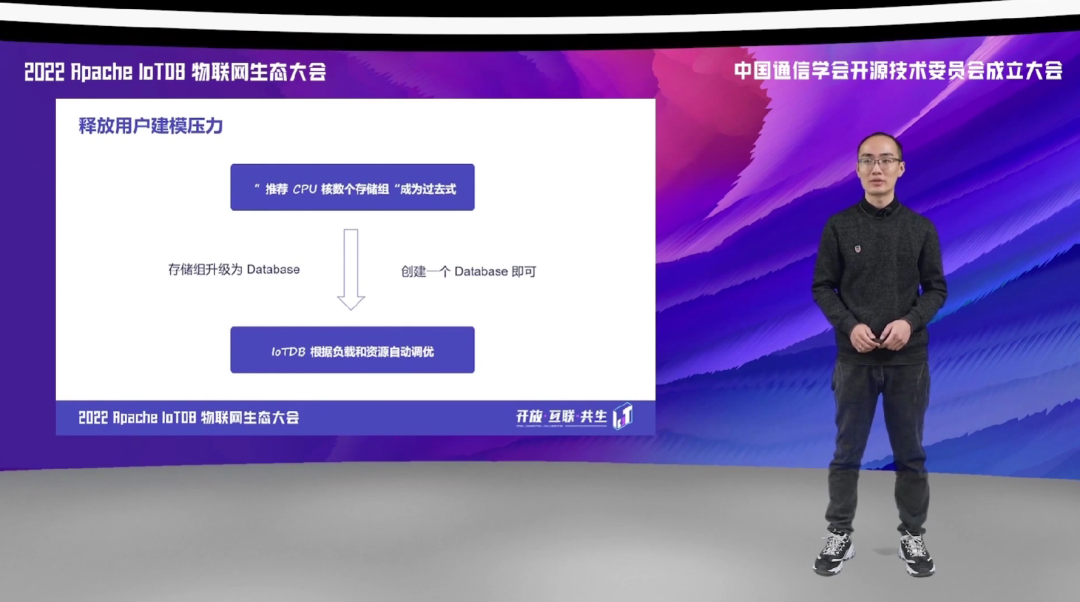 好,在 0.13 以前的版本里面,我们经常说“推荐 CPU 核数个存储组”,这句话已经成为了过去时。在新的版本里面,存储组这个概念升级成了 Database,那么用户只需要创建一个 Database 即可。所有的负载和资源都由 IoTDB 来去进行一个监控,并且能够在不同的场景下面,为用户的写入负载进行一个优化。