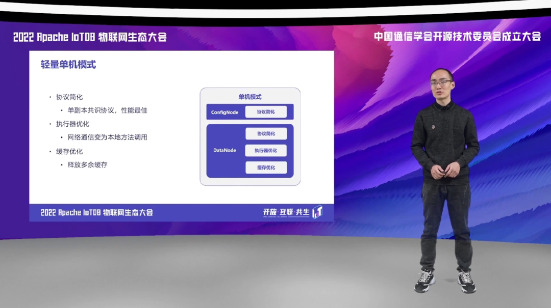 为了适配轻量单机模式,我们做了三个地方的优化。第一个就是协议层的简化,我们提供了一个单副本的共识协议。第二个就是执行器的优化,因为单机的模式下面,数据和元数据都是在一个节点内部的,所以这个时候很多网络通信就可以改成本地方法调用。第三个就是缓存的优化,我们可以去释放多余的、在分布式里面为了远端传输的一些分布式的缓存。