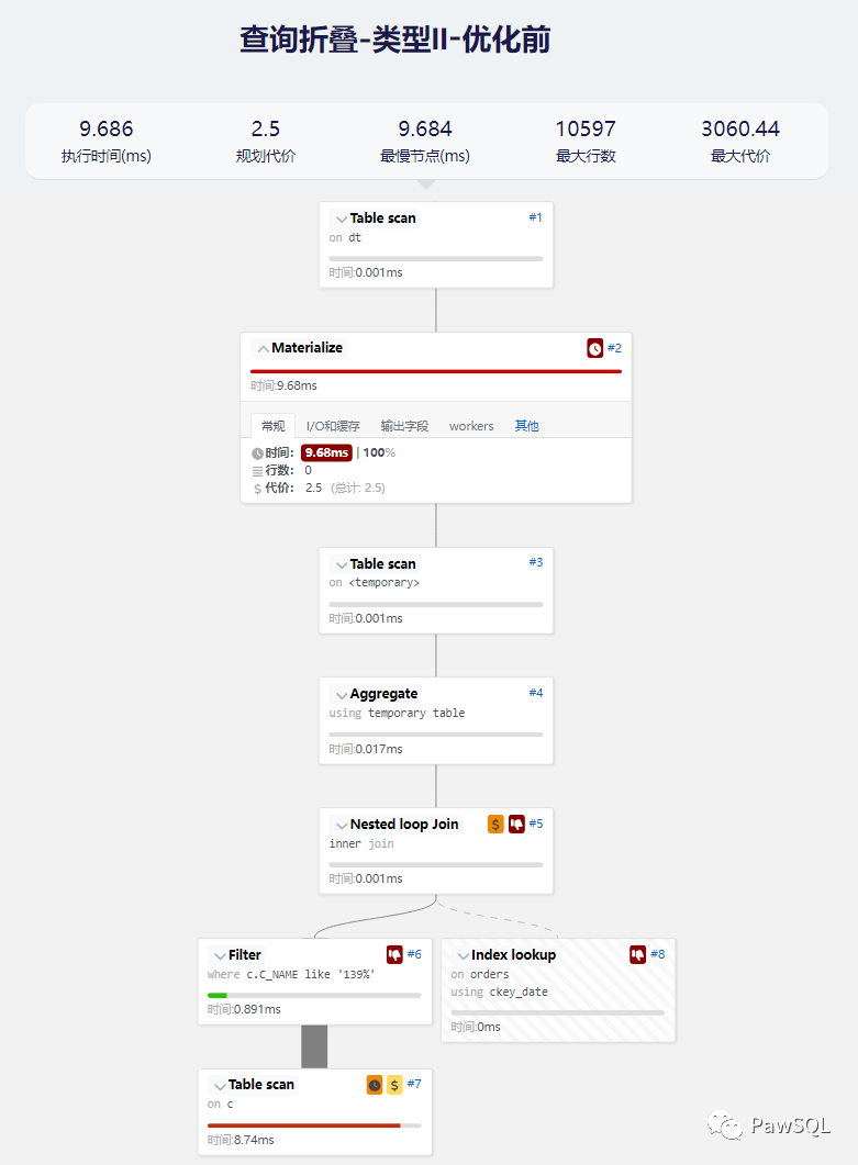 我们可以看到,原查询的执行计划中有一个物化步骤,通过SQL重写后,消除了此物化步骤。