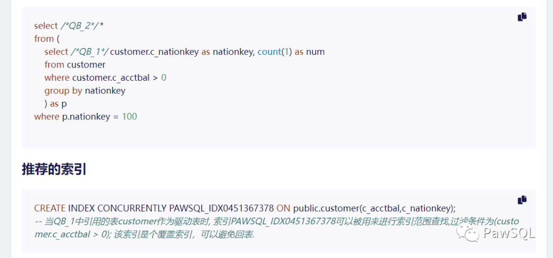 PawSQL的索引推荐是基于查询块(Query Block)的,某些重写优化算法能够将索引推荐相关的部分推导或是下推至查询块中,从而让索引推荐引擎推荐出合适的索引,下面以过滤谓词下推重写为例,介绍重写优化如何影响索引的推荐。