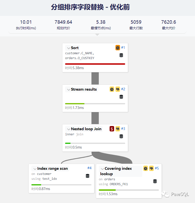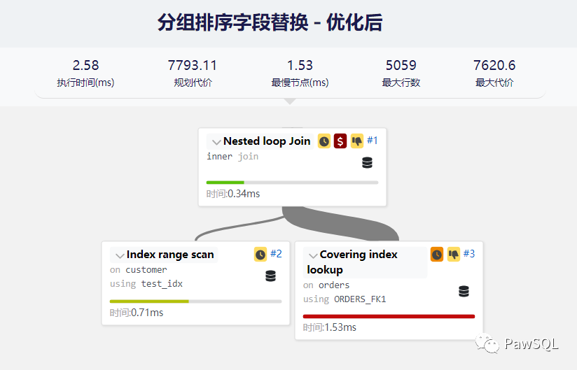 但是如果能从查询中推断出排序字段与另一个表的某个字段具有等值的关系,可以使用此字段来替换原排序字段,从而利用索引的有序性,在进行排序或分组时避免一次排序操作,从而提升SQL查询性能。