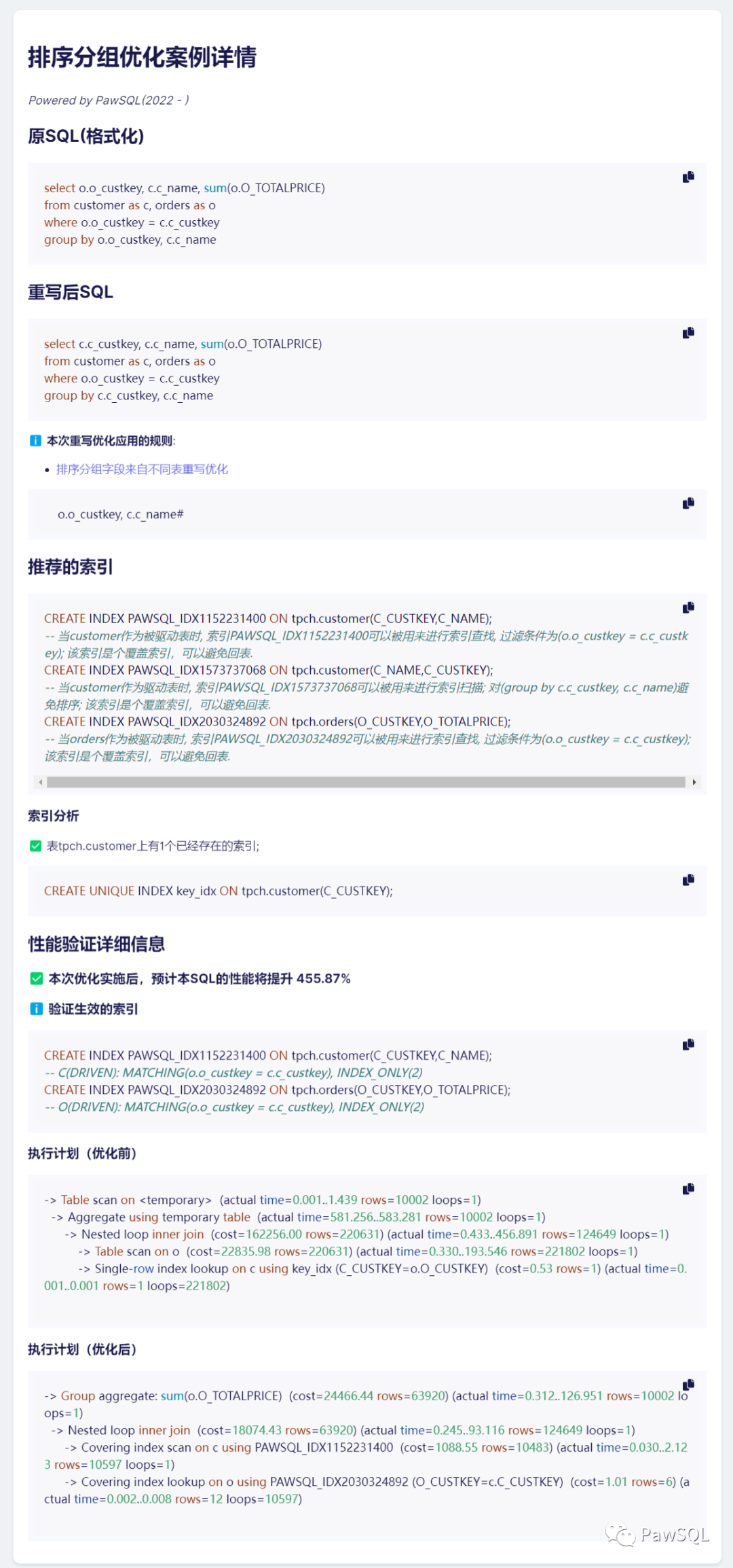 自动优化:用户输入待优化SQL后,PawSQL对其进行自动化优化,案例SQL的优化详情如下。