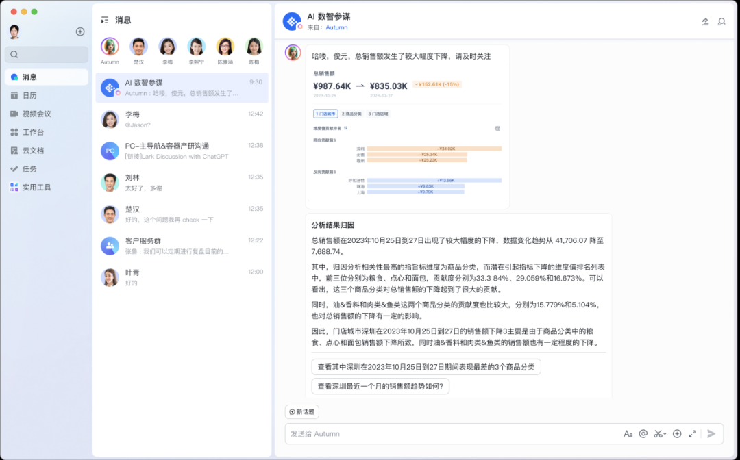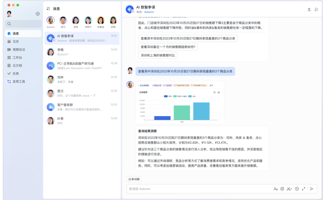 AI 数智参谋将清晰的条形统计图和洞察报告提供给您,并向您汇报了深圳区域表现最差的3个品类,这也是导致整体销售额下降的一个主要因素。在获取了可靠的数据洞察后,您决定将分析过程保存下来,并在飞书内转发给对应地区的负责人进行跟进。