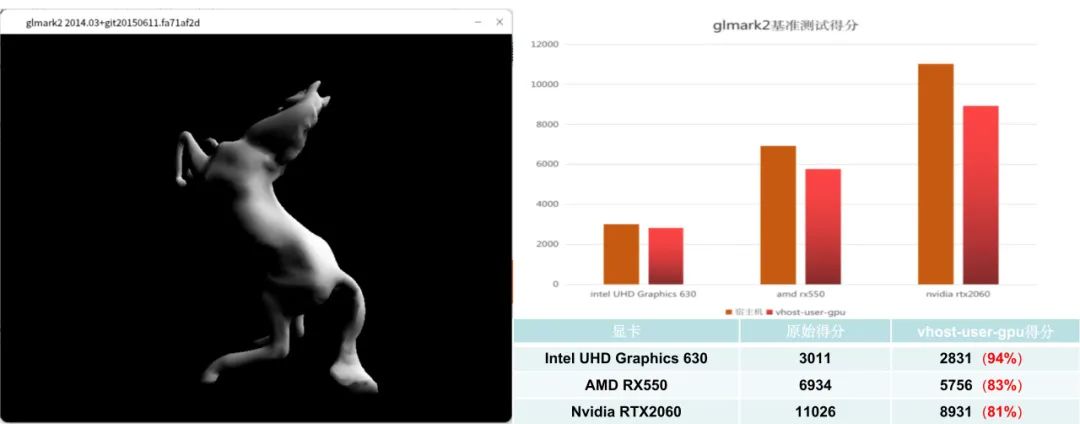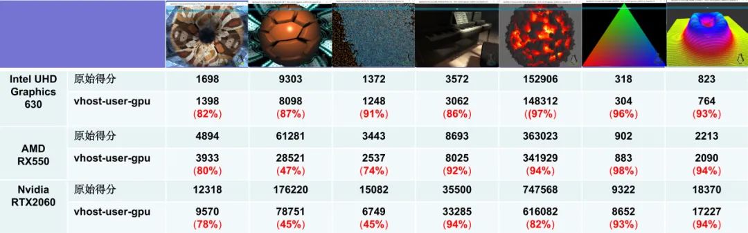 在glmark2基准测试下,vhost-user-gpu在分别以三种不同类型的GPU作为后端渲染加速GPU的情况下,测试得分均达到甚至超过物理GPU的原始测试得分的80%。