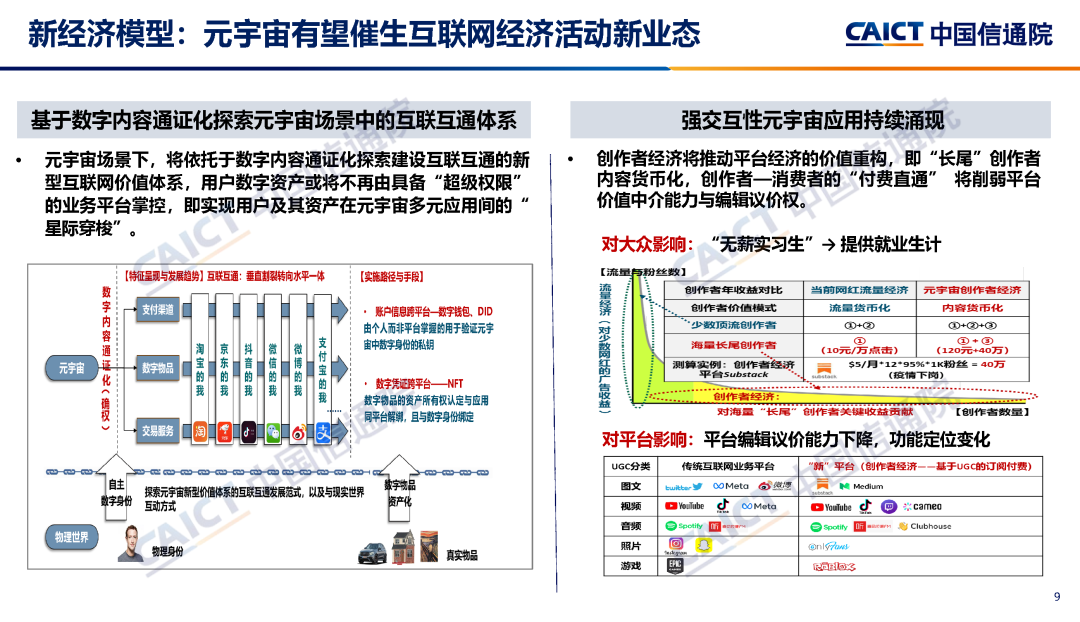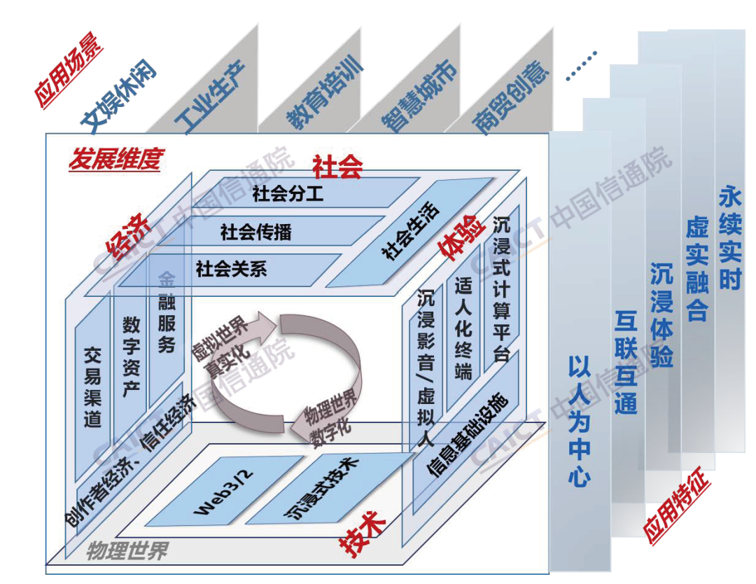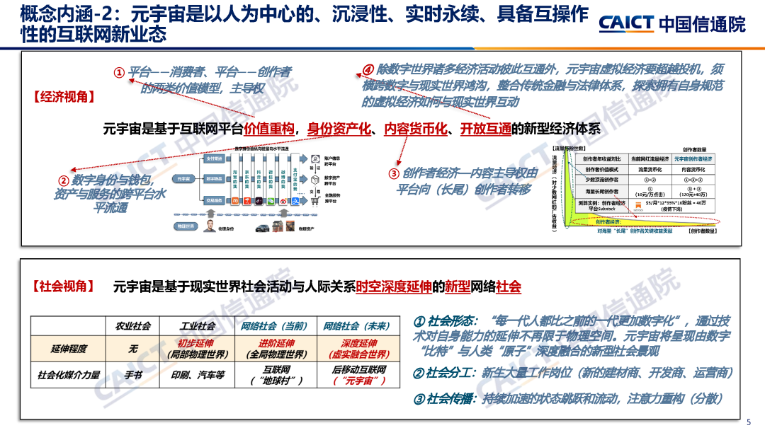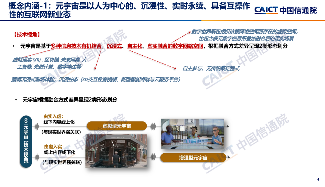 1. 概念内涵方面,元宇宙是以人为中心的、沉浸式、实时永续、具备互操作性的互联网新业态,将催生3D虚实融合的数字体验,是新一代信息技术集成创新和应用的未来产业,是数字经济与实体经济融合的高级形态,将创造由数字“比特”与人类“原子”深度融合的新型社会景观。