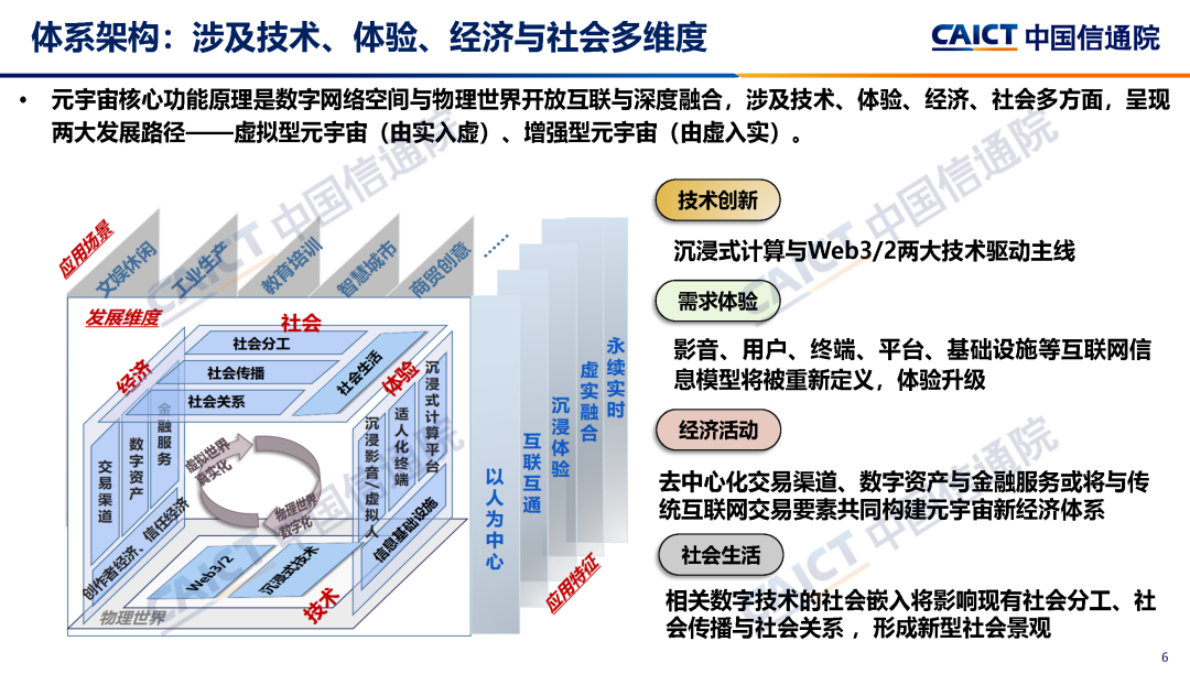 2. 体系架构方面,元宇宙的核心功能原理是数字网络空间与物理世界的开放互联与深度融合,其体系架构涉及技术、体验、经济与社会多维视图。