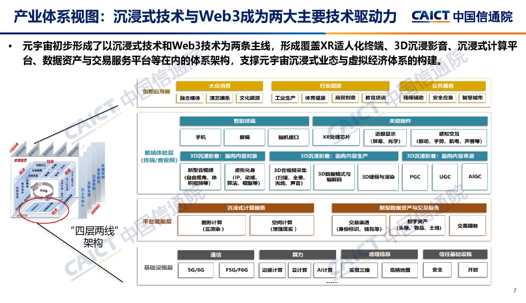 4. 技术产业体系方面,建立“四层两线”的元宇宙技术产业体系,自下而上可分为基础设施层、平台赋能层、前端体验层、创新应用层四部分,形成以XR为代表的沉浸式技术和基于区块链分布式信任机制两条主线,XR适人终端、3D沉浸影音、沉浸式计算云服务平台等元宇宙标志性产品/服务。