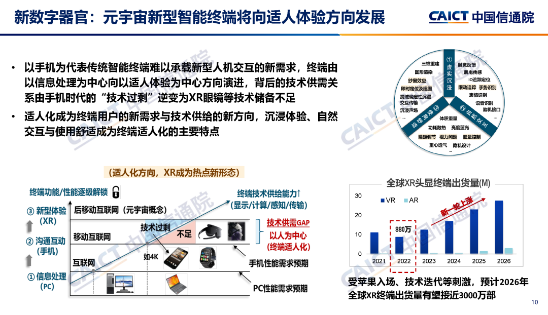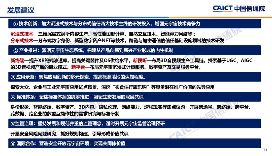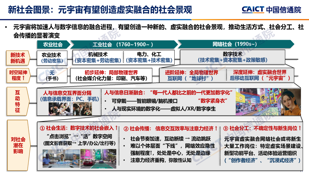 3. 发展趋势方面,元宇宙具有多重战略意义。一是新信息形态,元宇宙中数字信息形态将由虚实分离向虚实融合演进。二是新数字器官,元宇宙终端入口将以信息处理为中心向以适人体验为中心演进。三是新经济模式,数字内容通证化、创作者经济等将有望催生互联网经济活动新业态。四是新社会图景,元宇宙数字技术的社会嵌入将推动社会生活的发展演进。