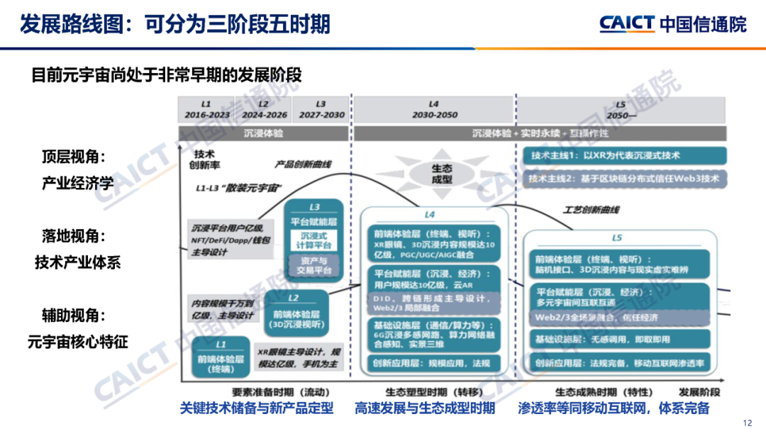 5. 发展阶段方面,元宇宙发展可大致分为三时期五阶段。在要素准备时期(2030年前),依次完成元宇宙前端体验层中适人终端、3D沉浸视听层和平台赋能层中两类云服务平台共三个阶段的关键技术储备与新产品定型。在生态塑型时期(2030-2050年),元宇宙真正步入高速发展与生态成型时期,前端体验层、平台赋能层用户规模达到十亿量级。在生态成熟时期(2050年后),元宇宙用户规模达到当前移动互联网渗透率,3D数字世界与物理世界无缝融合。