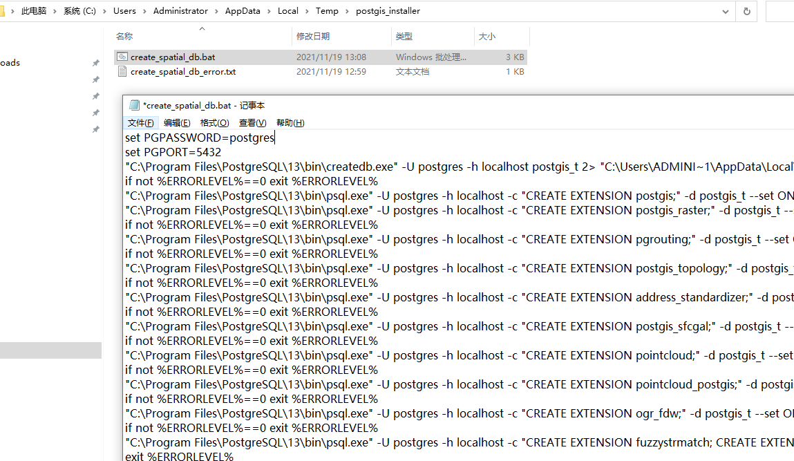 出现个小插曲,我的数据库用户密码输入错误了,可以先完成 PostGIS 插件的安装,安装完成后执行它的建库脚本就行了