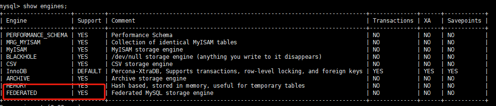 可见,已经支持FEDERATED存储引擎