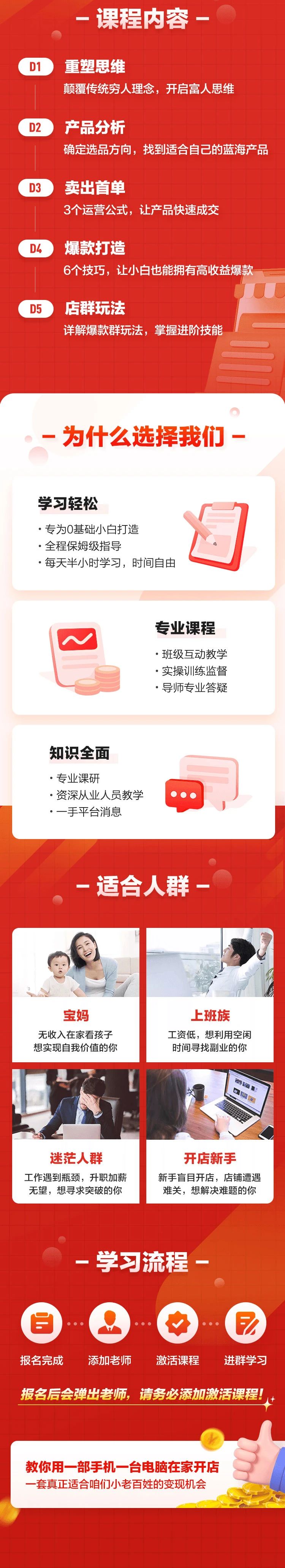 只要你按照老师教的模板挑选货源、利用赠送的工具一键上架,就能把淘宝店铺开起来赚钱了。