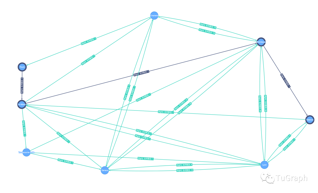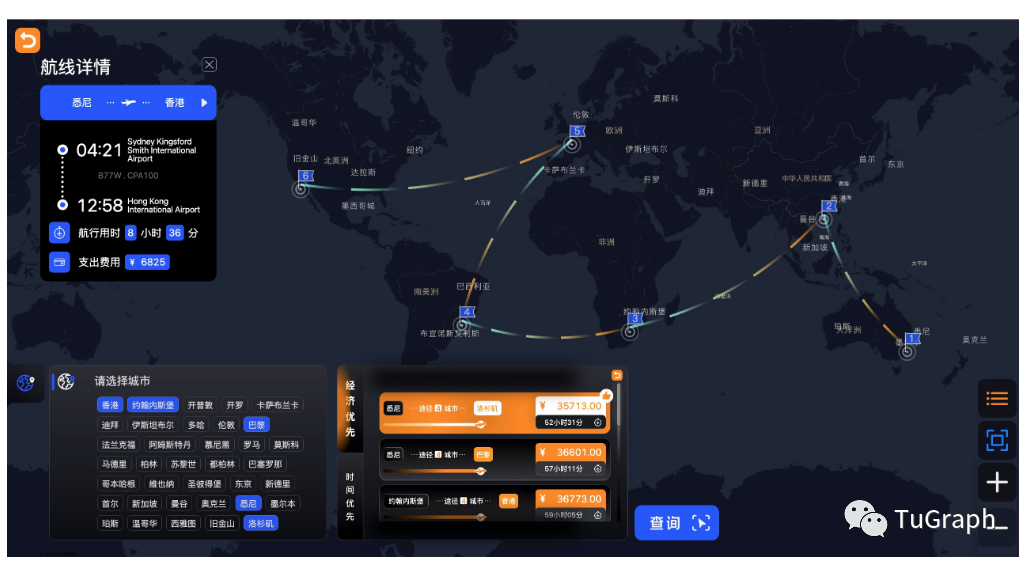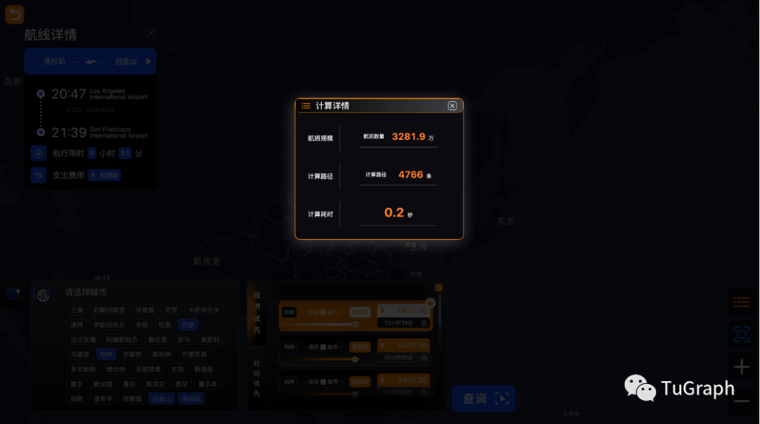 用户选择目标城市后,点击查询按钮。TuGraph服务就可以快速的进行路径规划和推荐,并且会统计出本次的计算结果和计算时间。