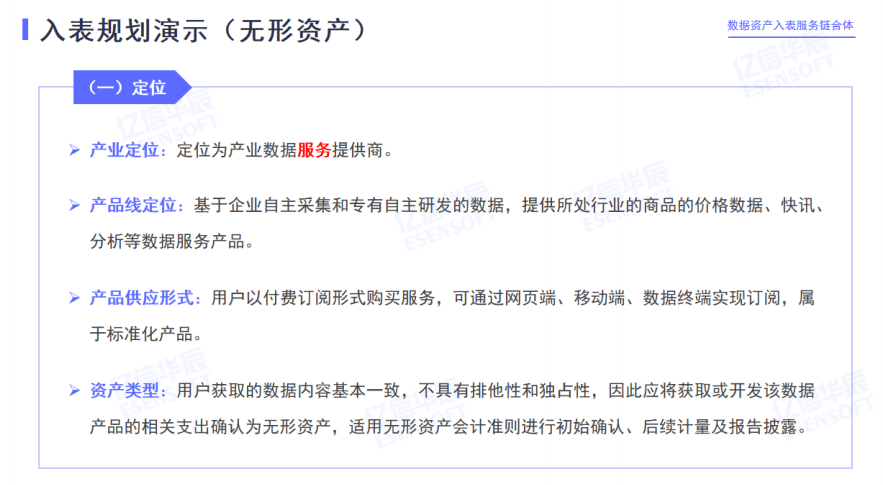 首先要完成产业定位。在这个规划演示的虚拟案例里,定位为产业数据的服务提供商。“服务”二字特意标红了,因为内部使用和对外服务属于无形资产。