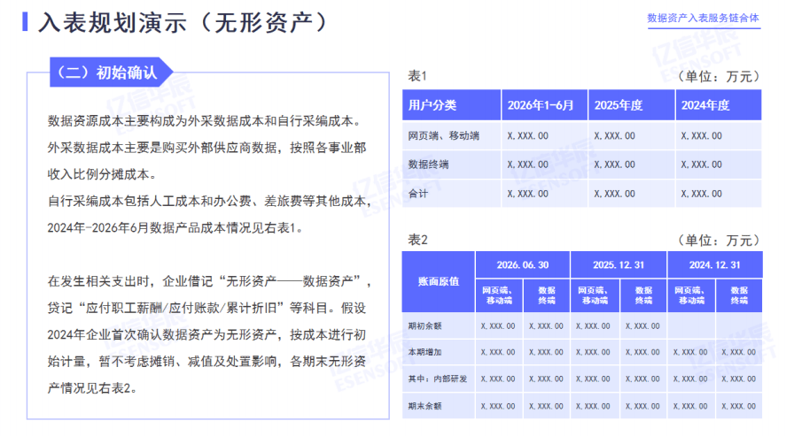 在发生相关支出时,企业借记“无形资产——数据资产”,贷记“应付职工薪酬/应付账款/累计折旧”等科目。这其实就是一个入表时的科目的问题。假设2024年企业首次确认数据资产为无形资产,按成本进行初始计量,暂不考虑摊销、减值或处置影响,各期末无形资产情况见右表2。