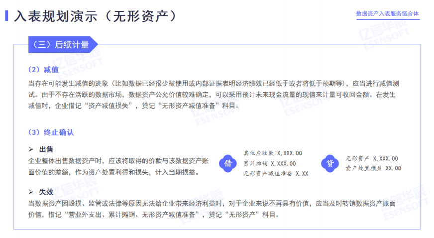 但如果无形资产资产处置失效的话,包括当数据资产因损毁、监管或法律等原因,无法给企业带来经济利益时,企业应及时转销数据资产账面价值,借记“营业外支出、累计摊销无形资产减值准备”,贷记“无形资产”科目。