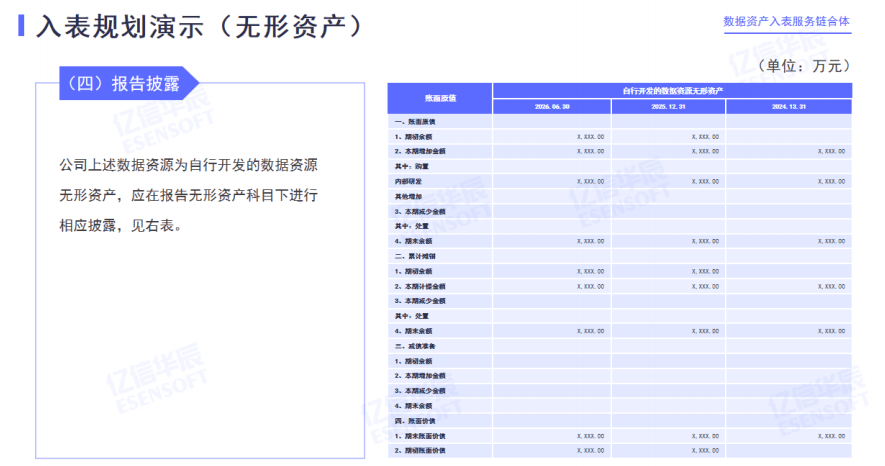 报告披露即公司上述数据资源为自行开发的数据资源无形资产,应在报告无形资产科目下进行相应披露。财政部的暂行规定已经提供了一个非常好的模板,我们基于模板再次给大家进行了展现,具体见右表。