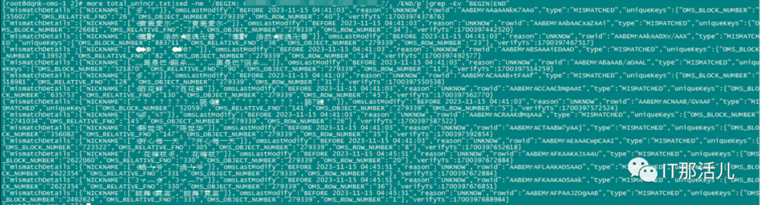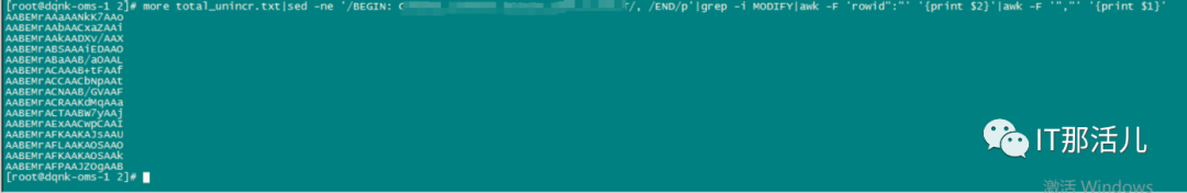 more total_unincr.txt|sed -ne '/BEGIN: owner.table_name/, /END/p'|grep -i MODIFY|awk -F 'rowid":"' '{print $2}'|awk -F '","' '{print $1}'