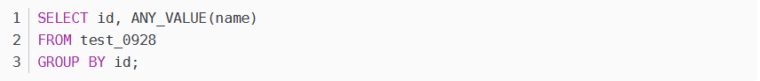 这里使用了GROUP BY语句,并在句中使用了ANY_VALUE函数。由于在MySQL的非聚合查询中选择非聚合列必须使用聚合函数或包装在聚合函数中,所以使用ANY_VALUE函数来获取每个分组内的任意一个name值。通过按id分组,使用ANY_VALUE函数,实现了按id获取每个分组的任意一条记录的id和name。