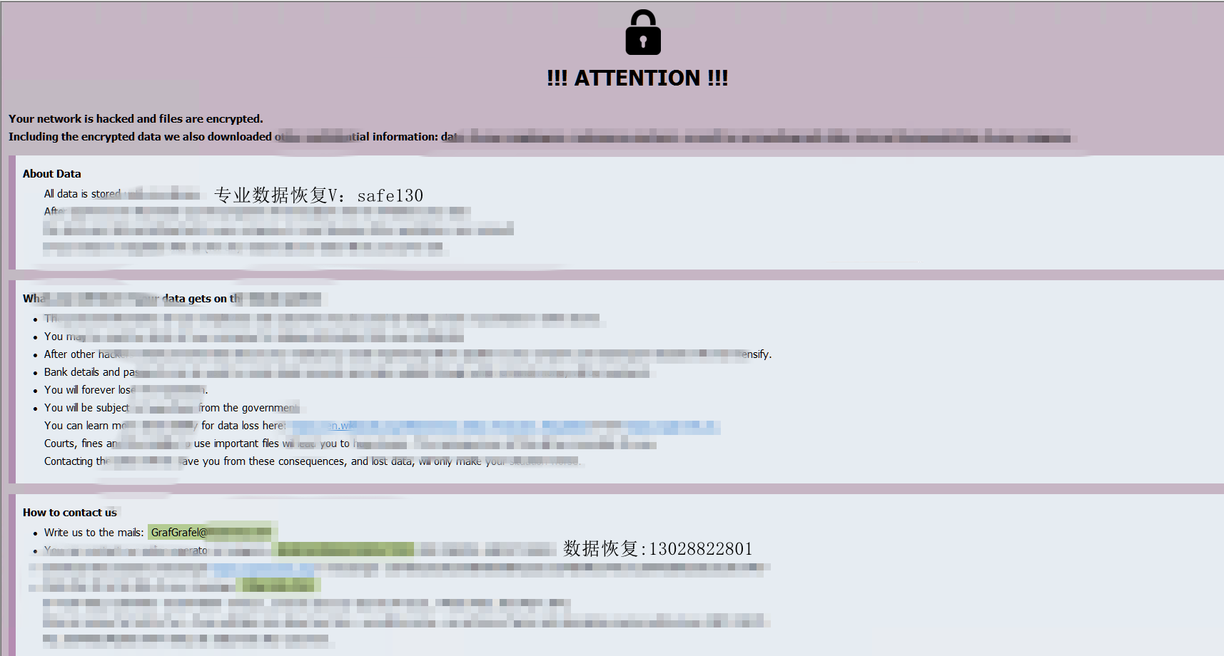甲公司是沿海省份一家中型玻璃制品公司,某天早晨发现其关键业务数据库被.[GrafGrafel@tutanota.com].GrafGrafel勒索病毒攻击并加密后,经过多方比较,他们选择了专业的数据恢复公司瑞安(safe130)进行紧急恢复。