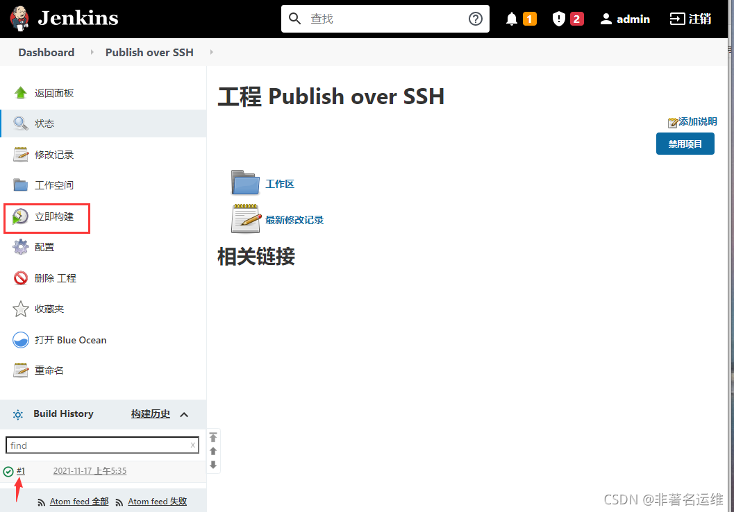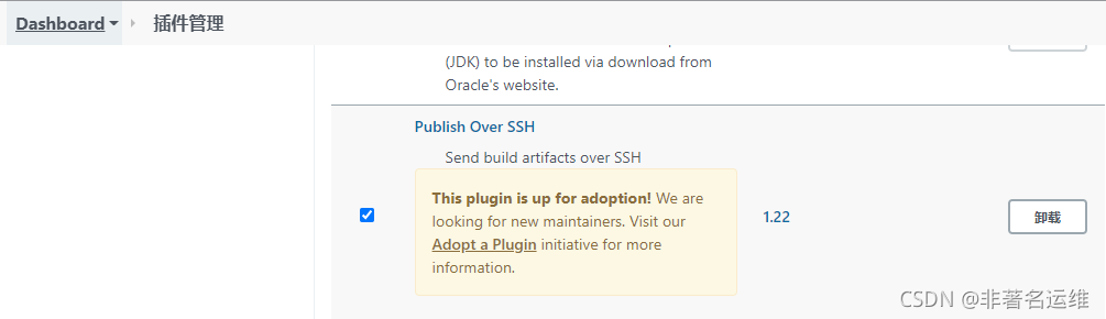 在主机192.168.1.18的Jenkins中【系统管理】—【管理插件】中,过滤出“Publish over SSH插件”,然后直接安装插件,如图安装即可,或者去官网下载插件的.hpi文件通过高级选项中手动安装也可以。