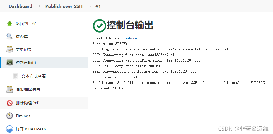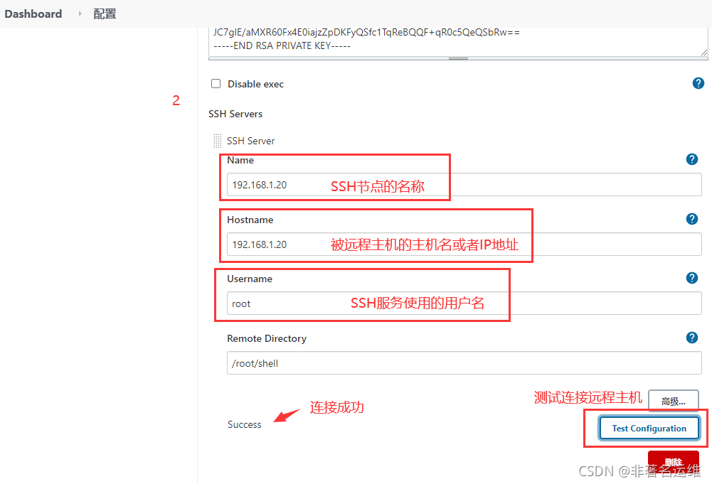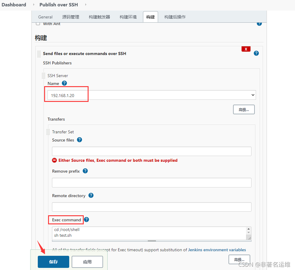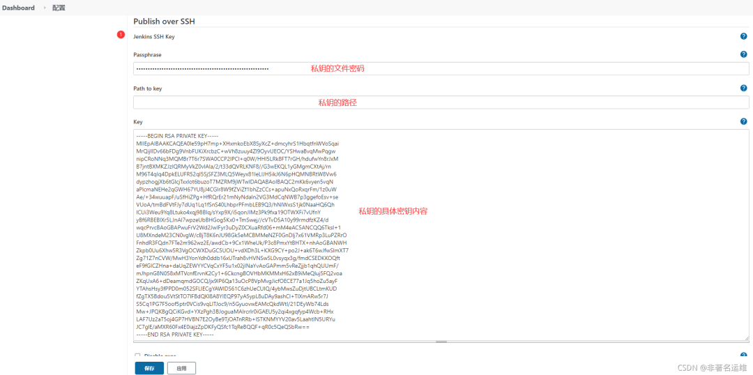 注意:私钥指的是Jenkins主机上生成的私钥,公钥在上面已经发送给被远程主机了。Passphrase:SSH的密码,使用用户名/密码登录时为用户名的密码,使用私钥登录时为私钥的密码。