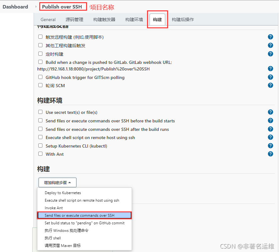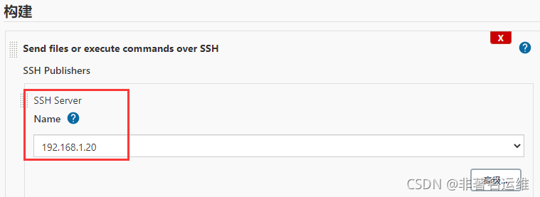 Name:SSH节点配置的名称,在构建中使用Publish over SSH插件时,此名称将出现在“SSH Server”中“Name”的下拉列表中,如下图: