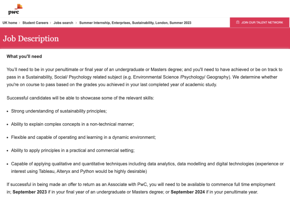 以PWC针对ESG的暑期实习生招聘需求为例,第一条就是要求对于可持续发展的概念有基础的了解。